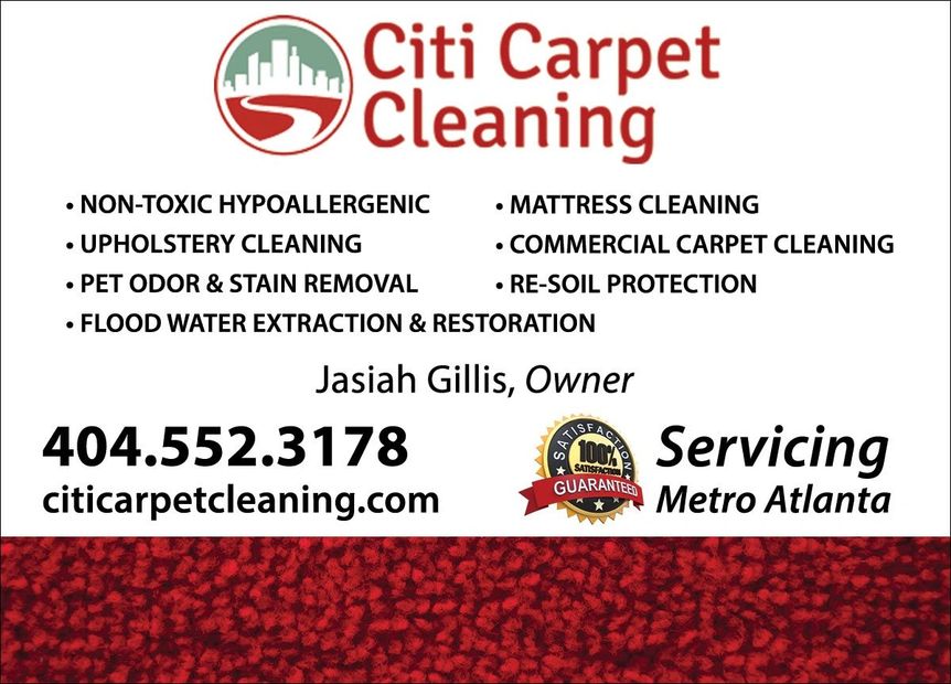 Citi Carpet Cleaning has been proudly serving metro Atlanta since 1995. Today, Citi Carpet Cleaning has earned a reputation for being one of the best cleaning and restoration companies in the state of Georgia. Using well maintained, high-powered, truck-mounted equipment, we deliver guaranteed, exceptional service. We offer responsive and reputable services 24 hours a day, 7 days a week. We have built a company that is known for excellent cleaning results, dependability and exceptional customer service. We invite you to experience Citi Carpet Cleaning’s stellar services today. CALL NOW FOR A FREE ESTIMATE!